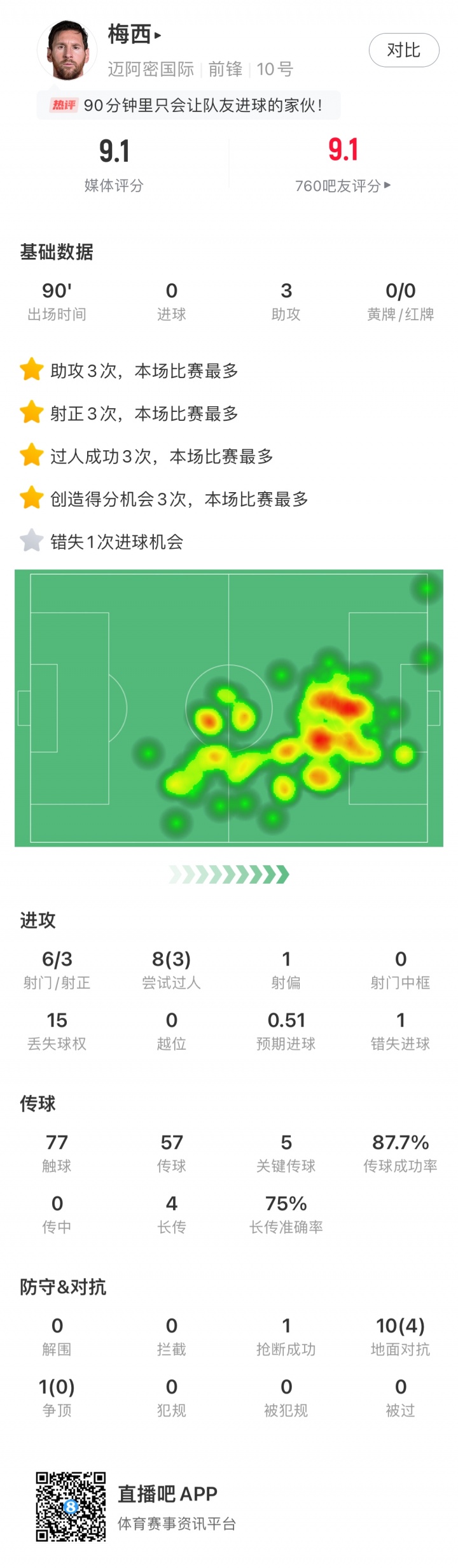 梅西本场数据:助攻戴帽,1次错失得分机会,媒体评分9.1分