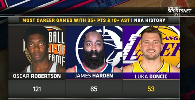东契奇生涯已53次至少35分10助 历史第三&哈登65次第二
