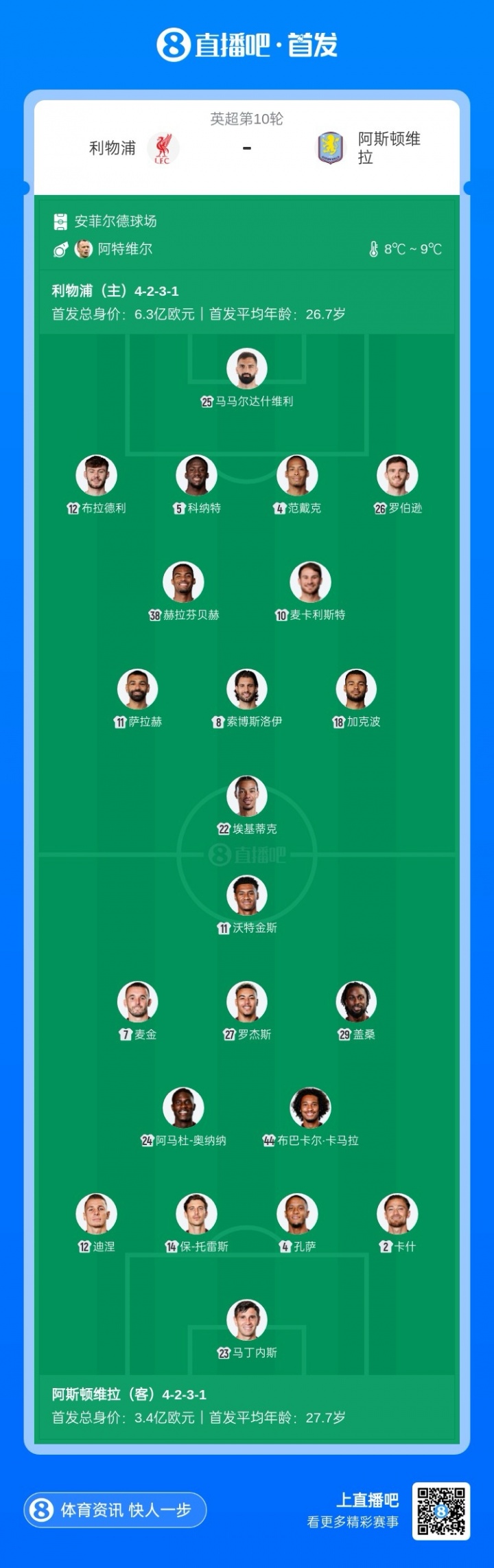 2025-11-02 08:11:33利物浦vs维拉首发:萨拉赫、埃基蒂克、罗杰斯先发,维尔茨替补